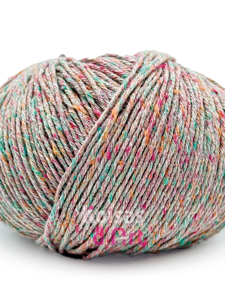 Mondial Azzorre é um fio sustentável feito de 70% algodão reciclado e 30% algodão, com um elegante efeito tweed que mistura cores para criar padrões únicos.