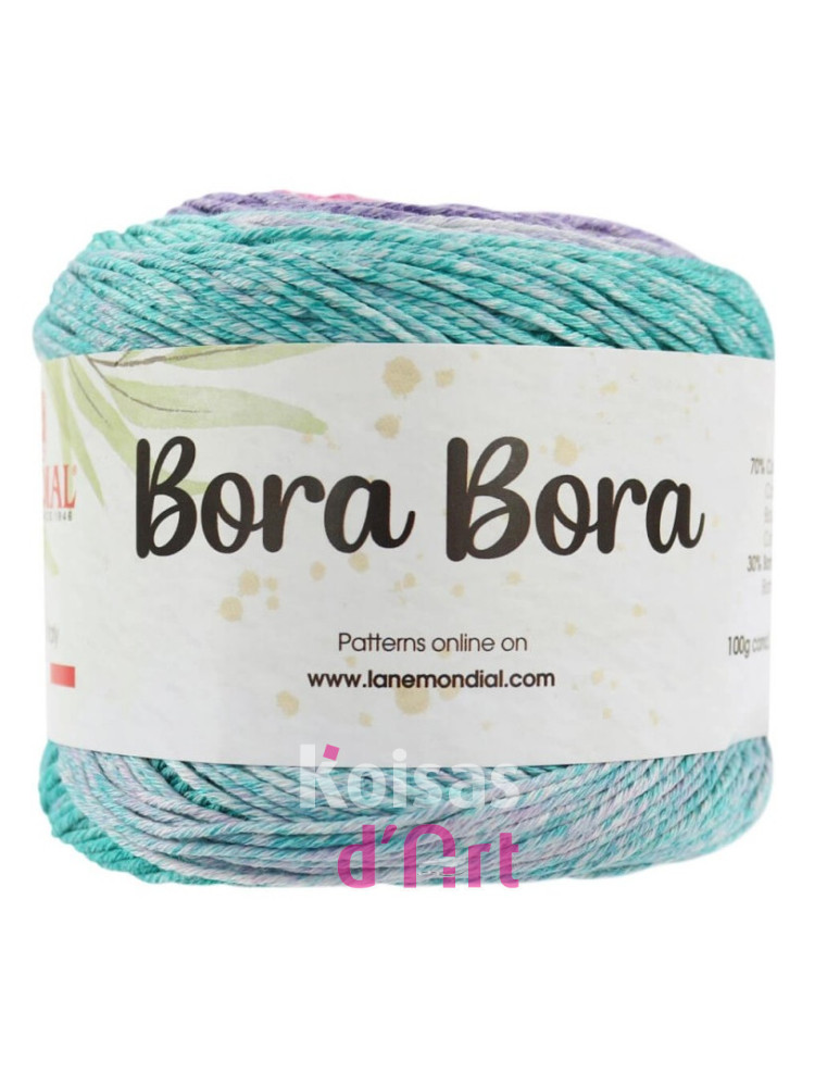 Mondial Bora Bora é um fio sustentável feito de 70% algodão e 30% de Bambu, com um matizado suave e listado, cria peças com aparência muito bonitas, duráveis e frescas, devido ao Bambu empregue na sua constituição.