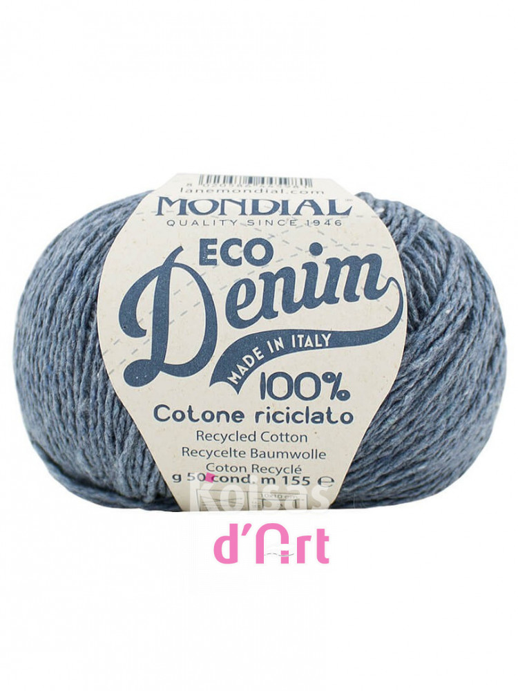Eco Denim é um fio reciclado a partir de 100% algodão, dado ser um fio reciclado tem cores que não são de um tom sólido mas sim de uma mescla muito suave do tom principal com ligeiras imperfeições dos fios reciclados.