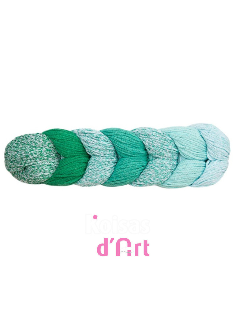 Cada novelo apresenta um degrede de 7 cores diferentes que darão um efeito de cor especial ao seu trabalho. É ideal para criar acessórios como bolsas, nécessaires ou xailes, ou para fazer decorações para a casa, como toalhas de mesa, tapetes e outros projetos coloridos.