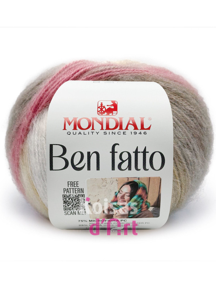 Mondial Ben Fatto é um fio felpudo, de textura macia e aconchegante, composto por 75% microfibra acrílica e 25% lã.