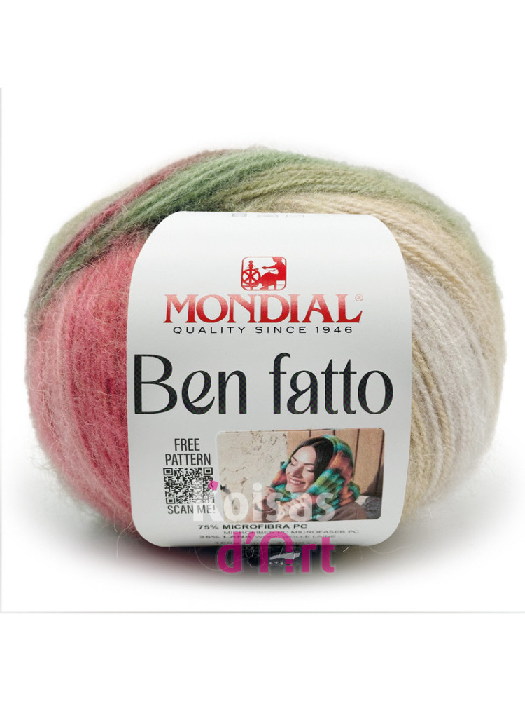 Mondial Ben Fatto é um fio felpudo, de textura macia e aconchegante, composto por 75% microfibra acrílica e 25% lã.