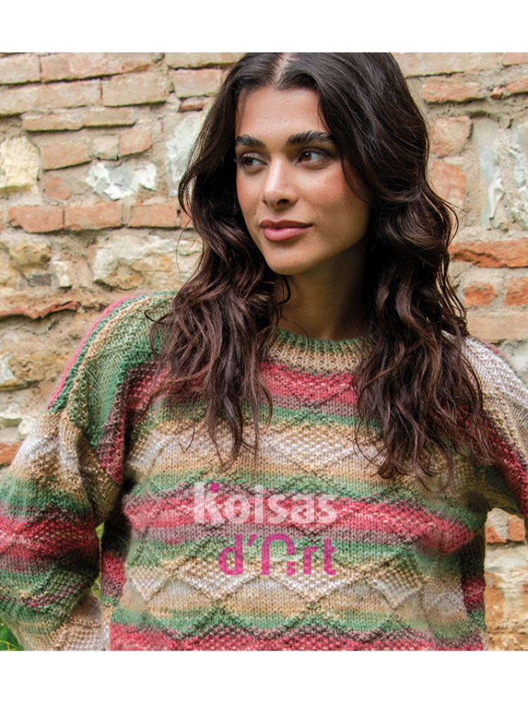 Apresenta um efeito escovado e estampado em tonalidades multicolores e brilhantes, proporcionando peças de grande impacto visual mesmo com pontos simples.