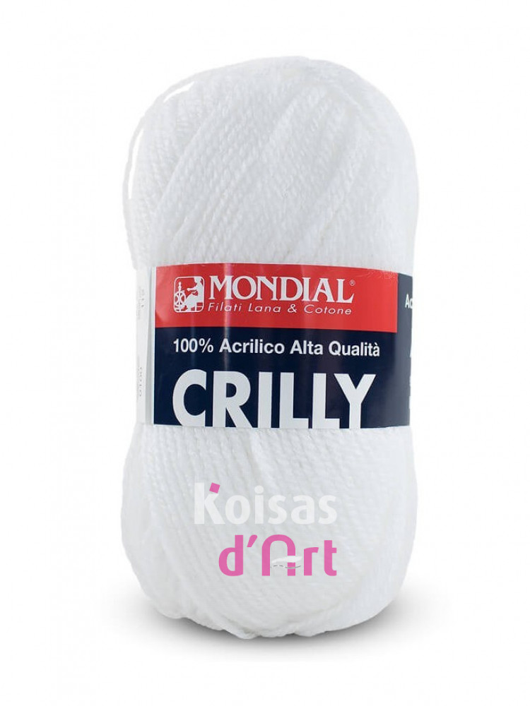 Crilly da marca Mondial, é uma fibra acrílica Dralon da Bayer. É um acrílico de qualidade superior, com toque macio e que não forma borboto. Adequada para recém-nascidos, ou maiorzinhos e também indicada para a confeção de mantas e cobertores ou agasalhos.