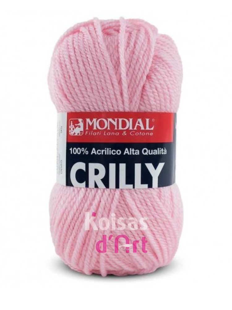 Crilly da marca Mondial, é uma fibra acrílica Dralon da Bayer. É um acrílico de qualidade superior, com toque macio e que não forma borboto. Adequada para recém-nascidos, ou maiorzinhos e também indicada para a confeção de mantas e cobertores ou agasalhos.