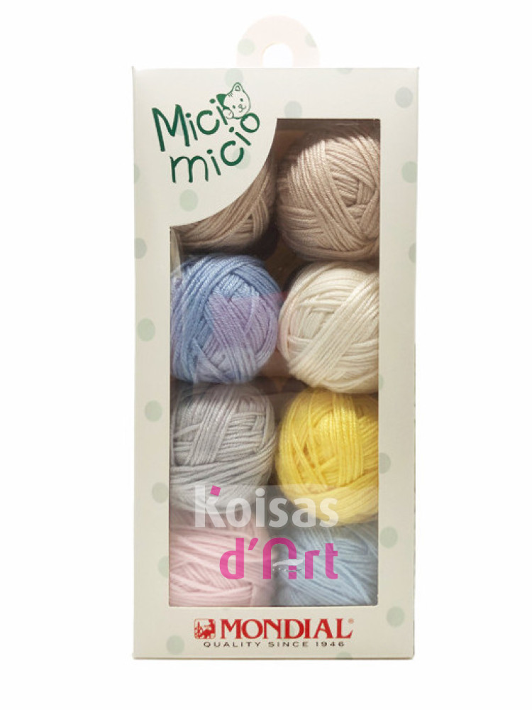 De Mondial Lanas - Micio Micio é apresentado numa embalem que contêm um conjunto de 16 mini-novelos de 7 cores de tons pastel com uma paleta combinada ao pormenor para que possa fazer os seus projetos de croché ou outra qualquer peça que empregue cores variadas.